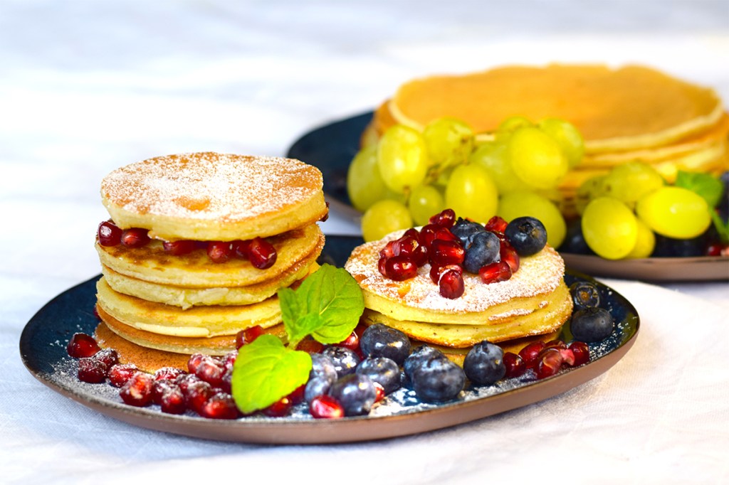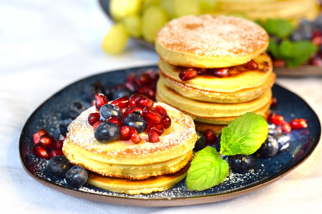 Pancakes mit Blaubeeren und Granatapfelkernen