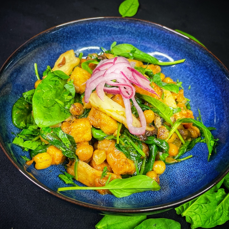 2 Stücken festen Tofu á 280g (trockenpressen und in Würfel schneiden), 200g Kräuterseitlinge, 1 Büchse Kichererbsen, 300-400g Spinat, 5 Knoblauchzehen, 1 ½ Limetten, 1 große Gemüsezwiebel, 1 große rote Zwiebel, 3 EL weißen Balsamico, Kokosblütenzucker, Salz, Pfeffer, 1 ½ EL Kreuzkümmel, Speisestärke, Rapsöl, 100ml Weißwein, 400ml Wasser, Petersilie