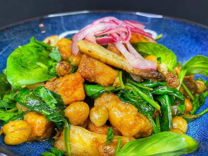 Die Tofuwüfel kommen mit 2 EL Maisstärke in eine Schüssel, vorsichtig vermischen, so dass sich ein gleichmäßiger Mantel um die Würfel legt. In einem kleinen hohen Topf portionsweise goldbraun braten oder frittieren, auf Haushaltskrepp beiseite stellen. Die Seitlinge werden in Scheiben geschnitten und bei hoher Hitze in Öl kurz gebraten. Anschließend salzen und pfeffern und beiseite stellen. In einer Pfanne röstet ihr nun in etwas Öl die Kichererbsen, etwas Zucker, Kreuzkümmel und Salz zum Schluss darüber streuen.