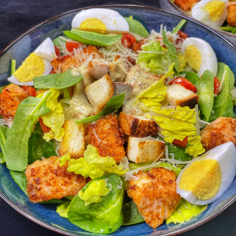 Lachs, Croûtons, Tomaten, Parmesan und Dressing auf dem Salat verteilen und geviertelte hartgekochte Eier zugeben.