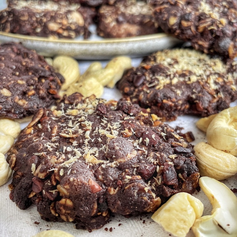 In einer Schüssel die trockenen Zutaten (Haferflocken, Mehl, Zucker, Vanille, Kakao, Backpulver, Kakao Nibs, Cashew Nüsse) gut vermischen. Das geschmolzene Kokosöl, den Ahornsirup und die Milch dazugeben und mit einem Löffel gut vermischen. Der Mix ist ölig/freucht sein, aber er wird später fest sobald er gebacken und abgekühlt ist.