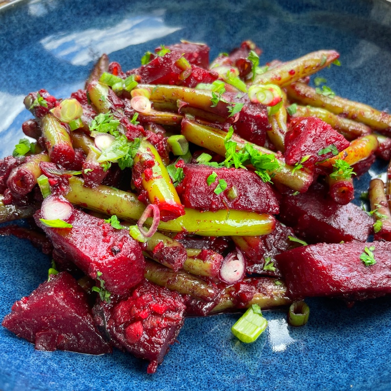 In einer Pfanne werden in Olivenöl die zerstoßenen Kreuzkümmel- und Koriandersamen angeröstet. Dann kommen die Rote Bete und der Zucker dazu. Die Temperatur hoch lassen, so dass sich Röstaromen bilden. Wenn das Gemüse am Boden ansetzt, fügt ihr die kleingeschnittenen Zwiebeln und den Knoblauch zu und löscht mit dem Wein und der Gemüsebrühe ab und streut die Gewürze darüber. Immer noch mit hoher Temperatur lasst ihr die Flüssigkeit verkochen. Nun kommen die Bohnen in die Pfanne und etwas Bohnenwasser. Die Temperatur kann heruntergeregelt werden und ihr gebt immer wieder ein wenig Bohnenwasser in die Pfanne, so dass das Gemüse schmort, nicht kocht und Biss behält.