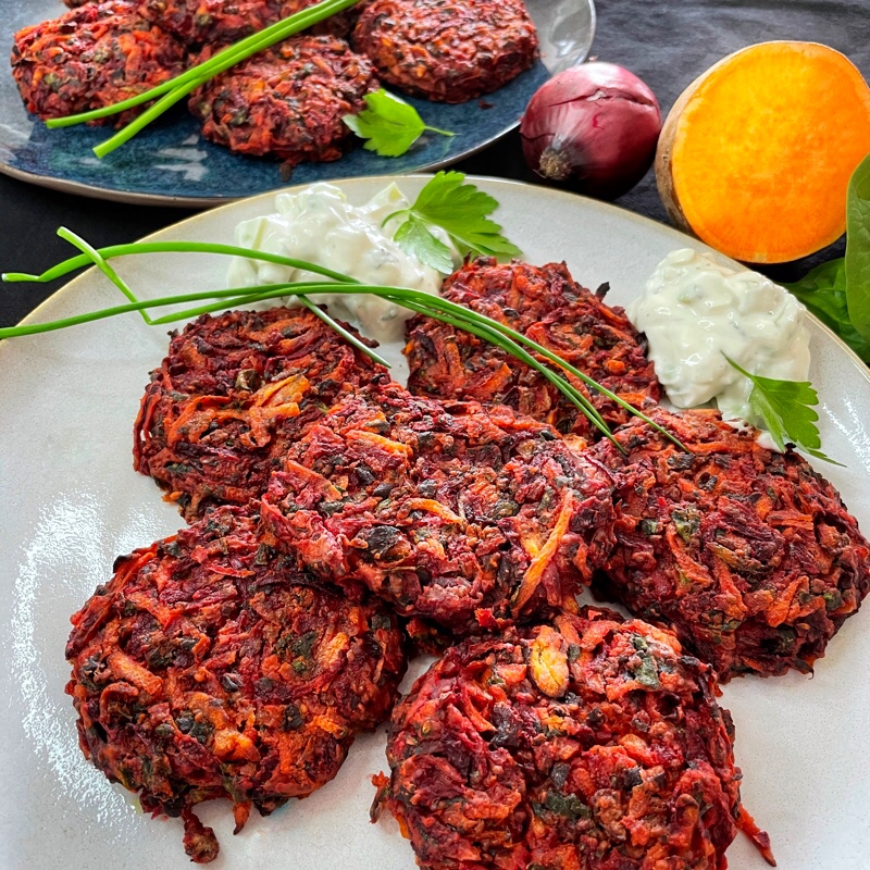 400g Kidneybohnen (abgespült und abgetropft), 600g Gemüse: 3 geriebene Karotten, 2 Rote Bete, 1 Süßkartoffel, 3-4 Kartoffeln, 70g fein gehackten Blattspinat (oder im Winter Grünkohlblätter), 1 rote Zwiebel (fein gehackt), 1 Knoblauchzehe (gepresst), 1/2 Bund Minze (gehackt), 1 Bund glatte Petersilie (gehackt), 90g weiße Tahin (Sesampaste), 50g Chiasamen, Salz, schwarzer Pfeffer, Olivenöl, 1 Prise Zucker, etwas Säure in Form von Obstessig (wir haben Cranberry Balsamessig verwendet)