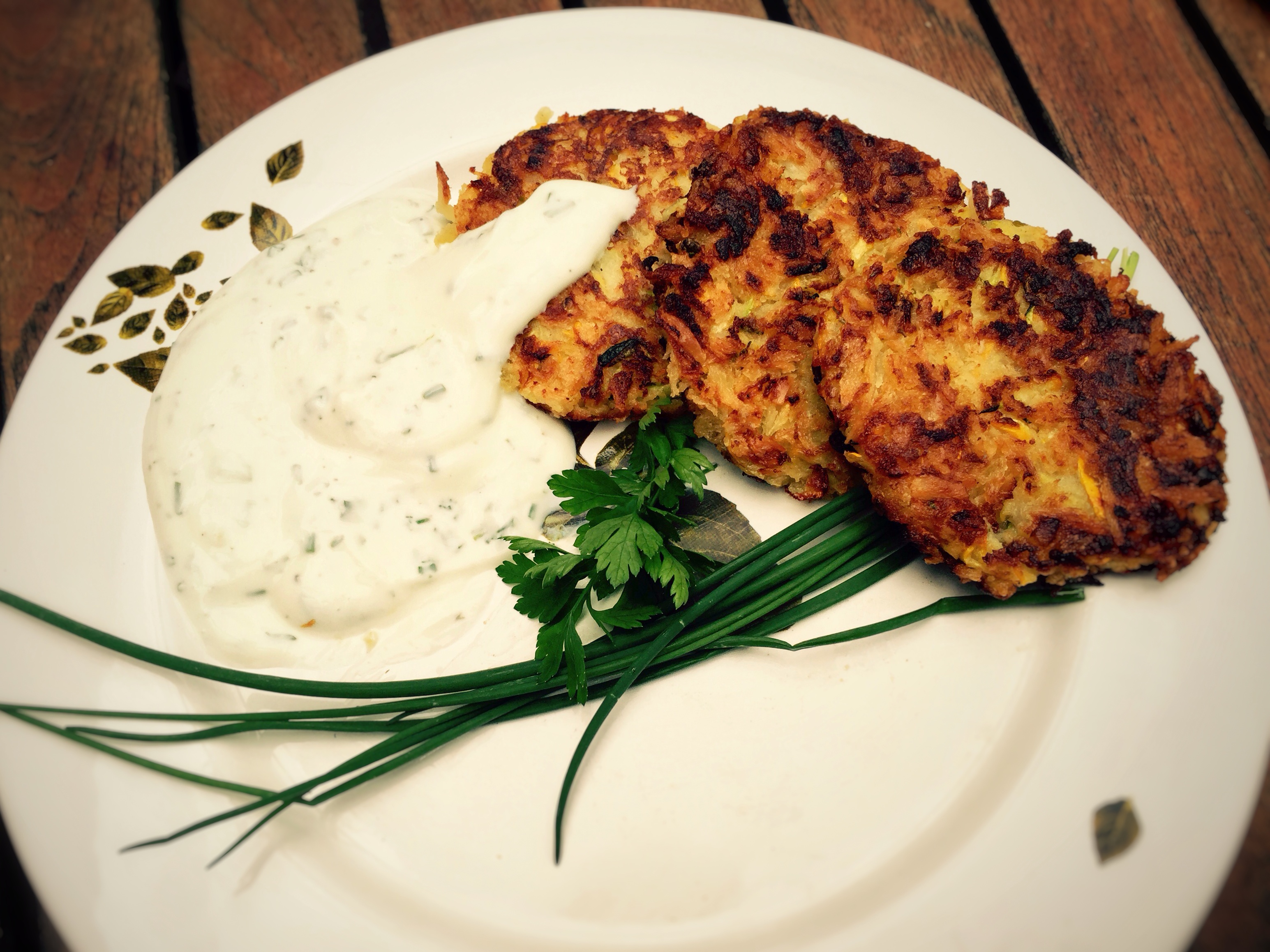 Die Zucchini grob, die Kartoffel fein reiben. Bei großen Zucchinies das Kerngehäuse vorab herausschneiden. Das geriebene Gemüse in einen Durchschlag (Sieb) geben etwas Salz dazu und ca. eine Stunde das Wasser abtropfen lassen. Wenn die Masse noch zu nass ist, könnt ihr sie in einem Leinentuch auspressen. Das Salz hilft das Wasser zu entziehen. Aber Vorsicht, der Schafskäse ist recht salzig.