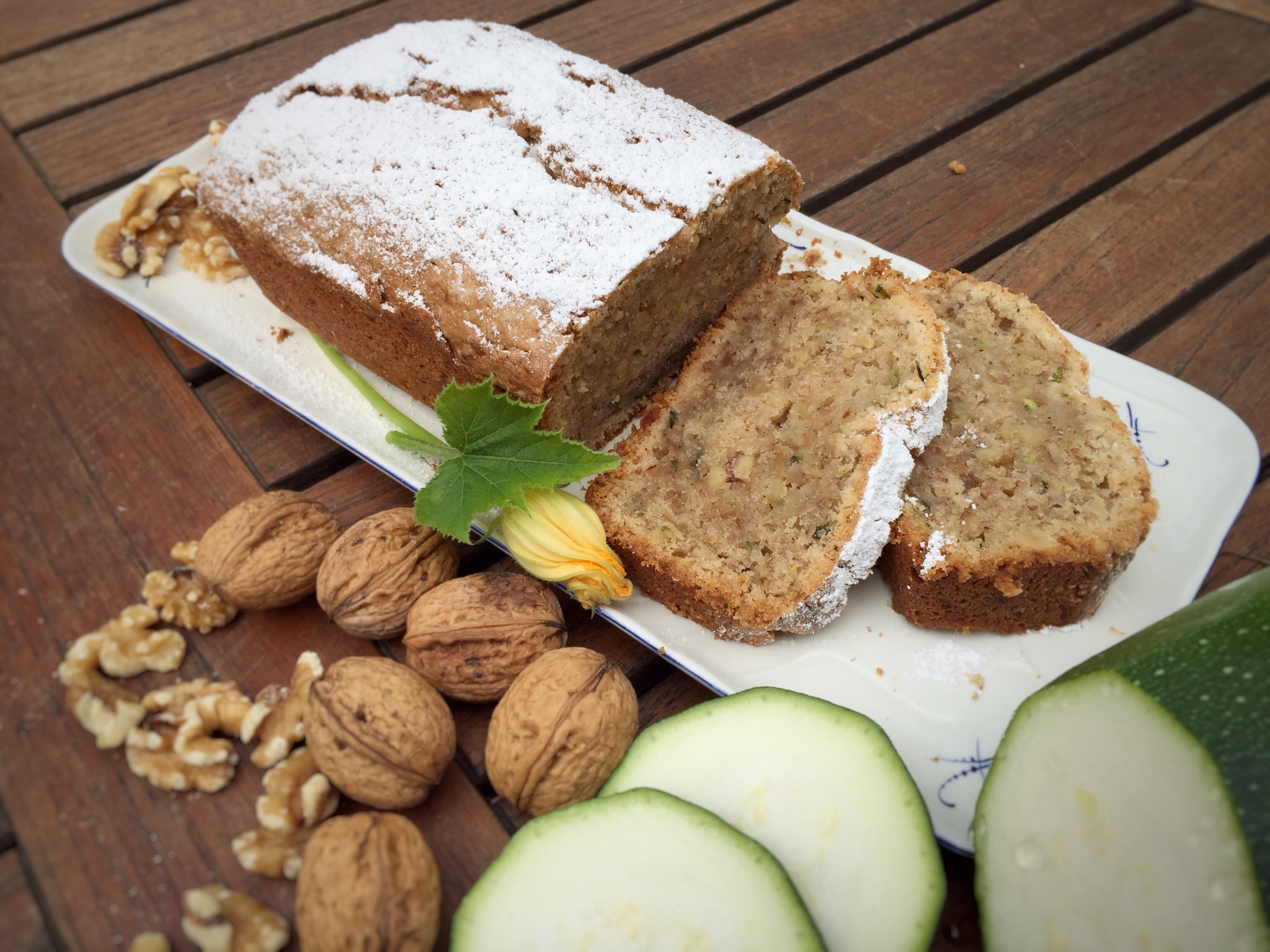 Ofen vorheizen. Die Eier mit dem gesamten Zucker, Vanillezucker und Öl verrühren. Das Mehl mit dem Backpulver vermischen, danach Zucchini und Walnüsse unterheben. Anschließend diese Mischung zu der Eiermasse dazugeben und unterrühren. In die Backform füllen und goldbraun backen.